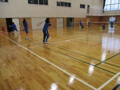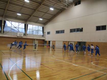 そのあとの部活動は,あいにくの雨で室内練習になりました。ソフトテニス部は,体育館の半面を使い,ウォームアップをしてからボールを打つ練習に進みました。次々メニューを行い,元気よく練習をしていました。