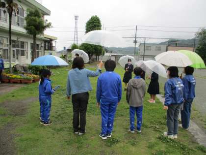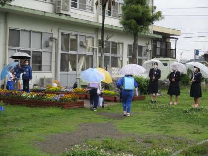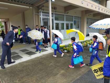 今朝はあいにくの雨模様でしたが,あいさつ運動がありました。いつものように各小学校で,民生・児童委員の皆さんや見守り隊の皆さんなど地域の方々と一緒に,児童会・生徒会本部やボランティアが,傘をさしたり屋根のあるところに入ったりしながら,元気よくあいさつしました。