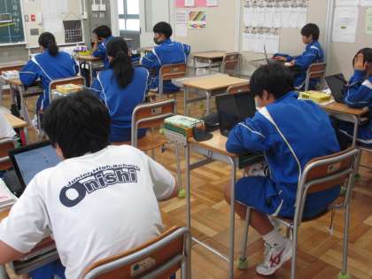 3年生の国語は少年の主張の推敲でした。主張を明確にした上で、いろいろな文章構成を検討し、内容にふさわしい主張に仕立てます。情報の入れ替えが自在なタブレットの良さを生かして、文章の構成を検討しました。