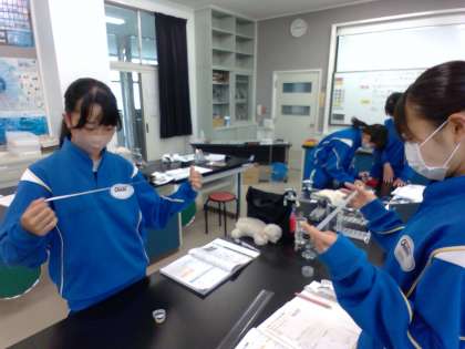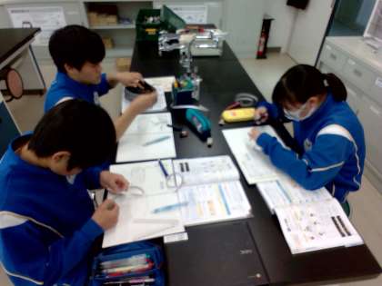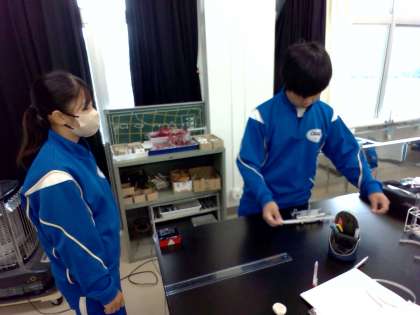 5月16日(木) 3年生(理科)「力を受けていないときの物体の運動」 公開日 2024/05/16 更新日 2024/05/16 できごと 物体が受ける力と物体の運動には、どのような関係があるのでしょう。今日は、力を受けていないときの物体の運動について学習しました。力学台車を押したあと、記録タイマーのスイッチを入れます。手で押したあとは、物体(力学台車)は力を受けていません。テープの様子から、力を受けていないときの物体の運動のようすを考えていきます。 授業 3年