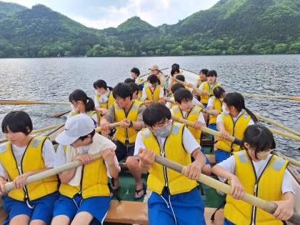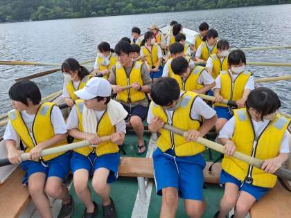 生徒20人で漕ぐと、カッター1艘にちょうどよい人数で、つまり交代ができません。そこで、引率教員も交代要員で一緒に漕ぎました。