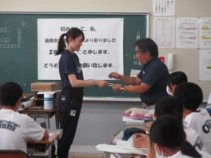 6月20日(木) 2年生(総合的な学習の時間)「チャレンジウィークに向けたマナーアップ学習」 公開日 2024/06/21 更新日 2024/06/21 できごと 2年生の総合的な学習の時間は、9月のCアレンジウィークに向けたマナーアップの学習でした。今日は事業所でのやりとりをシミュレーションし、名刺の渡し方や電話でのやりとりの仕方を学びました。 授業 2年