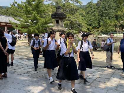 大仏をこれから見に行く班と見てきた班。暑くてどちらもへとへとです。