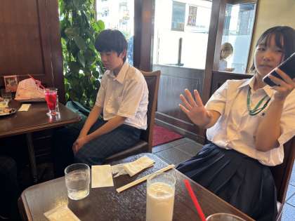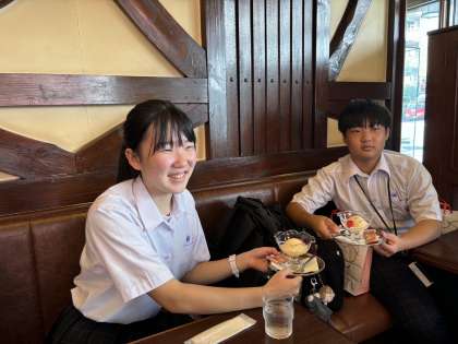 班別活動もあとわずか。散策中にひと休みです。暑いので冷たいものが美味しいでしょう。