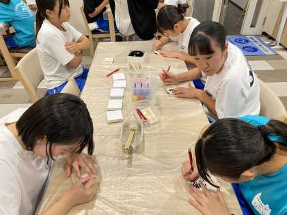 夕食の後は、体験学習の時間です。漆器の加飾体験に挑戦です。まずは下絵を写します。丁寧に進めています。