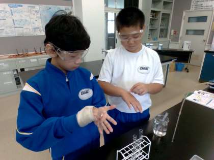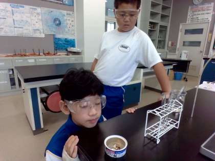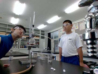 10月16日(水) 1年生(理科「赤ワインの蒸留」)【進んで学ぶ子】 公開日 2024/10/16 更新日 2024/10/16 できごと これまでに、エタノールと水の温度変化のグラフを作成し、状態変化と合わせて学習しました。赤ワインは、水とエタノールの混合物です。では、沸点のちがいを使ってエタノールを取り出すことはできるのでしょうか。実験で取り出した液体を手の甲につけたり、匂いを嗅いだり、火をつけてみたりして確かめました。 授業 1年