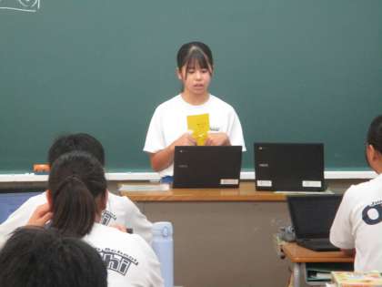 10月17日(木) 3年生(国語「ビブリオバトル」)【進んで学ぶ子】 公開日 2024/10/17 更新日 2024/10/17 できごと 3年生の国語はビブリオバトルでした。各自紹介文を作成した上で、自分のお気に入りの本について、熱く語っていました。 校長より 授業 3年