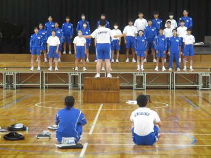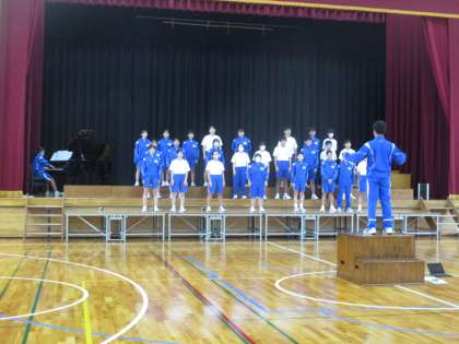 10月18日(金) 2年生(音楽「合唱」)【進んで学ぶ子】 公開日 2024/10/18 更新日 2024/10/18 できごと 2年生の音楽は合唱でした。今日は、体育館で練習しました。代表生徒が聞き手の側になって、各パートの音量のバランスや歌い方等について確認した上で、改善点を全体で共有し、練習で修正していきました。 校長より 授業 2年