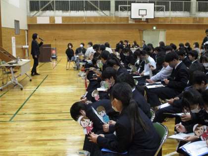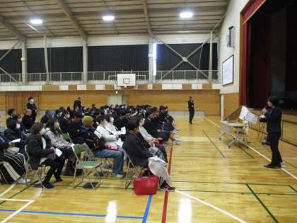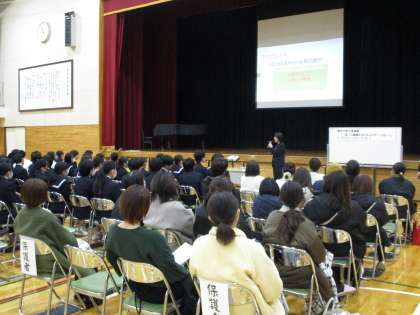 12月14日(土) PTA教育講演会 その1【進んで学ぶ子・思いやりのある子】 公開日 2024/12/14 更新日 2024/12/14 できごと 3、4校時はPTA教育講演会でした。講師として西部教育事務所の社会教育主事の先生方2名をお迎えし、「親子で学ぶ思春期〜互いに理解するコミュニケーション〜」と題して、演習形式で実施しました。本講演会は、西部教育事務所の「ワクわく子育てトーキング」という事業の一環で実施し、生徒・保護者・職員約100名が受講しました。 校長より 行事