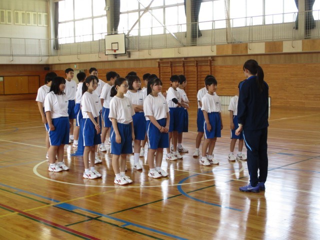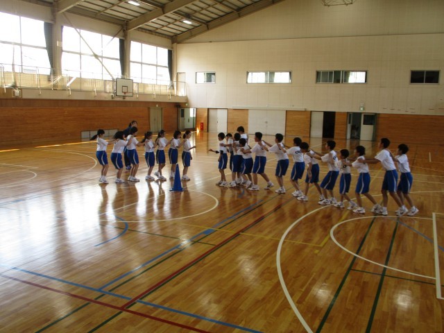 1年生の体育はフォークダンスでした。1年生は5月に高原学校に行きます。今日は、高原学校でのキャンプファイヤーの時に行うフォークダンスを練習しました。