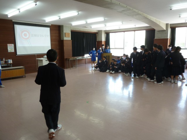 今朝は生徒会本部役員企画・運営による「生徒集会」を行いました。内容は、「鬼石中学校○✕クイズ」です。入学・進級から少し経ち、緊張も取れてきたところで、全校生徒に楽しい気持ちになってもらおうという生徒会本部の思いからの企画だと思います。「鬼石中学校は創立50周年である」「鬼石中学校の階段は173段である」といった鬼石中に関わる問題や「校長先生は3カ国語を話せる」「教頭先生の担当教科は数学である」といった先生に関わる問題までありました。「これは○だな」「えっ、分からない」生徒は、楽しみながら問題に答えていました。楽しいひとときになったと思います。生徒会本部のみなさん、ありがとうございました。