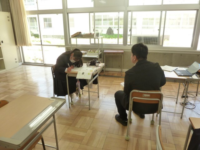 3年2組の社会は歴史的分野の学習をしました。第二次世界大戦が始まってから、日本は欧米諸国とどのような関係を築こうとしたのかを学びました。3年2組の社会はマンツーマンで行っているので、生徒の興味や学習状況などに合わせて授業が進んでいきます。授業の後半は、ワークの問題を解きながら、今日の学習を振り返ります。50分間集中して学習に取り組むことができました。