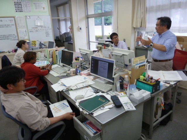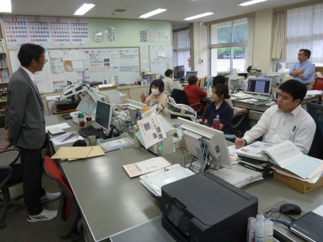 鬼石中は鬼石北小、鬼石小とともに「互いの違いを認め、支え合い高め合う児童生徒の育成 ~やる気の生徒指導の4つの視点を踏まえた教育活動の改善・充実~」をテーマに研修に取り組んでいます。生徒が下校した放課後に職員室に教職員が集まり今年度の研修について話し合いです。「子供たちの活躍を可視化することによって、主体的な学習を促す」ことが今年度の研修の大きな柱になっており、どのようにするとよいか意見を交わします。熱のこもった議論が行われました。教師の指導力を高めることが、生徒の学力向上につながります。「すべては子どもたちのために」を合い言葉に先生たちも頑張っています。