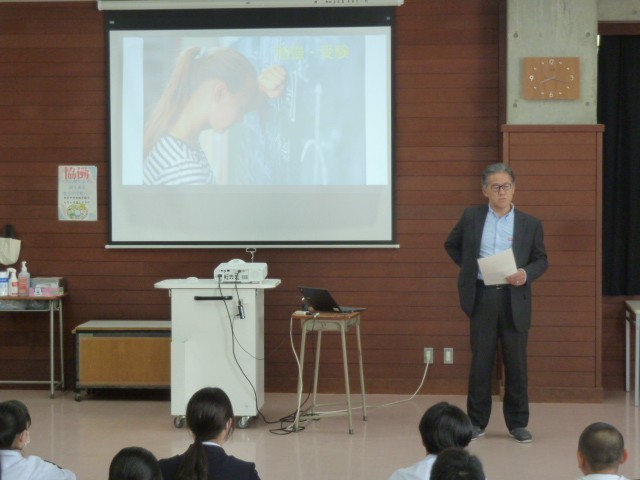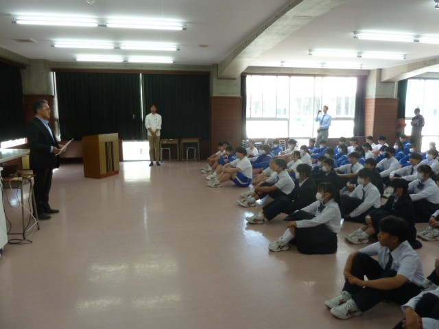 今月の朝礼での校長講話は、子どもの時に見た「麦踏み」についての疑問からスタートしました。校長先生は麦踏みの作業をしているのを見て「どうして植物を踏むの?そんなことをしたらだめじゃない?」と子どもながらに思ったそうです。しかし、麦踏みの作業は「節が強くなる」「倒れにくくなる」などの効果があり、しっかり根をはり、大きく成長するためには必要な作業なのです。中学生の日常の生活においても麦踏みと同じように考えられるのではと校長先生は生徒に語りかけます。毎日の生活では、うまくいくことばかりでなく、「失敗」や「挫折」を経験してしまうこともあるでしょう。そんな時こそ、「麦踏み」の話を思い出し、「失敗」や「挫折」も「大きく成長するためには必要だ」と考え、耐えていってほしいと訴えます。麦のように、困難を乗り越えた先には、ぐんぐんと伸びる大きな成長期が待っているのですから。
