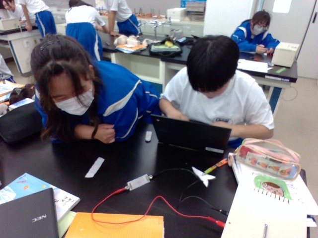 これまでに、酸性、アルカリ性、中性の水溶液の性質を調べてきました。この性質を元に、酸とアルカリの正体を突き止めることはできるのでしょうか。酸の代表「塩酸」と、アルカリの代表「水酸化ナトリウム水溶液」を用いて予想を立てました。電圧をかけていくと酸とアルカリの正体のイオンが移動する様子が見られました。塩化銅水溶液の電気分解の学びを活用して、実験結果から考察をしていきます。