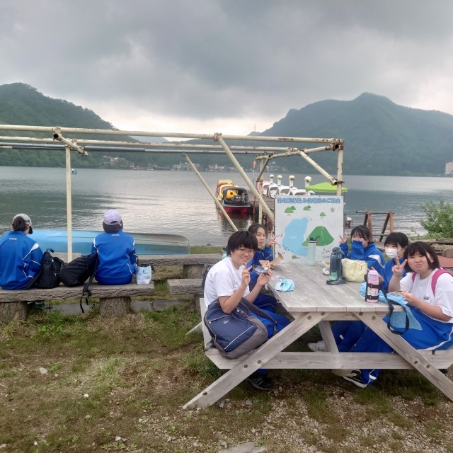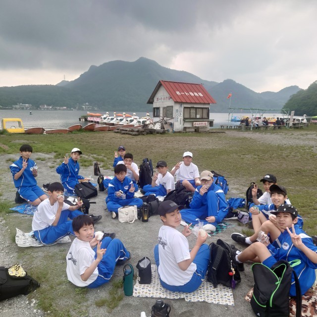 5月22日(木) 1年生(高原学校 榛名湖で昼食)【進んで学ぶ子・たくましい心身をもつ子】 公開日 2025/05/22 更新日 2025/05/22 1年高原学校 榛名湖の湖畔でお弁当です! 行事 1年