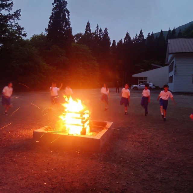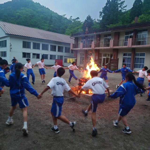 5月22日(木) 1年生(高原学校 キャンプファイヤー②)【進んで学ぶ子・たくましい心身をもつ子】 公開日 2025/05/23 更新日 2025/05/23 1年高原学校 キャンプファイヤー後半はダンスです。暗くなるまで何度も何度もみんなで踊りました! 行事 1年