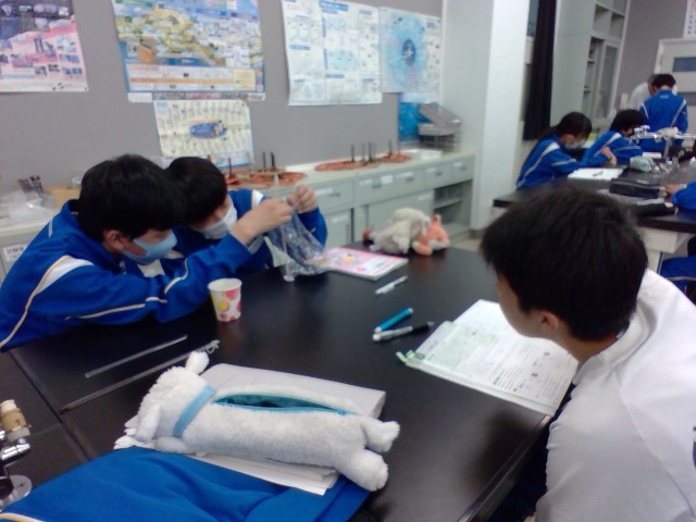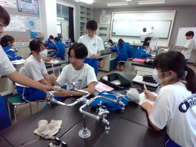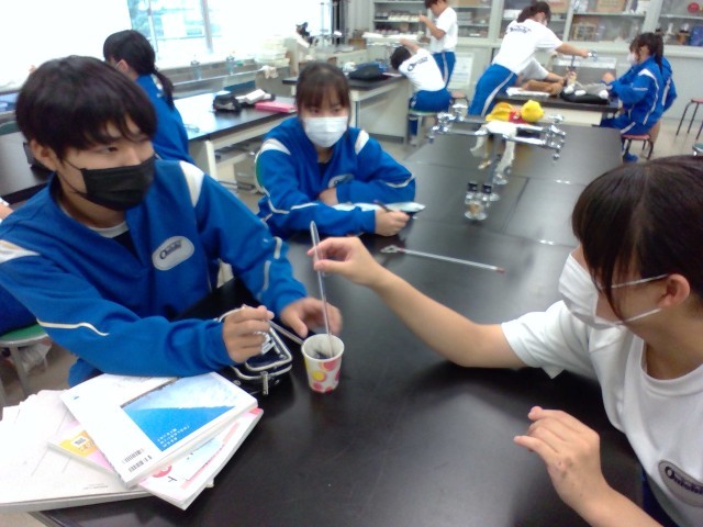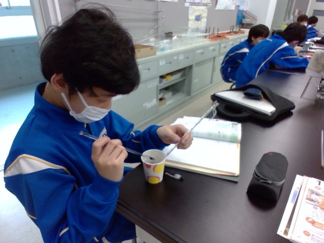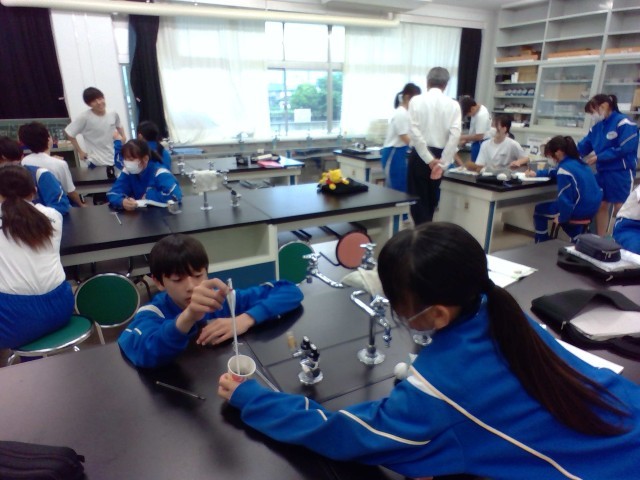 6月3日(火) 2年生(理科「化学変化と熱」)【進んで学ぶ子】 公開日 2025/06/03 更新日 2025/06/03 できごと これまで学習した燃焼では、熱が発生しました。では、ほかの化学変化でも熱は発生するのでしょうか。鉄粉と活性炭と食塩水を混ぜてみると、紙コップの中身は熱くなってきました。熱が発生しているようです。次に水酸化バリウムと塩化アンモニウムを混ぜてみました。今度は冷たくなりました。熱がうばわれたようです。 +2