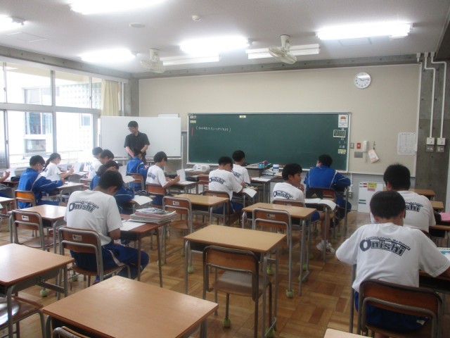 1年生の英語は助動詞canの学習でした。今日は、「私は~できます」という意味の英文をたくさん作ることで、この表現の使い方に習熟しました。