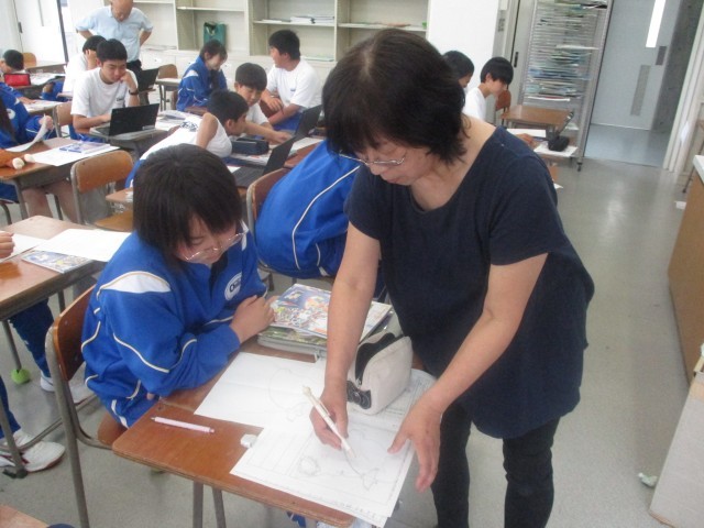 1年生の美術は平面構成の学習でした。今日は、自然の美しさから生まれた平面構成ということで、描きたい自然物やキーワードをもとに下書きをしました。
