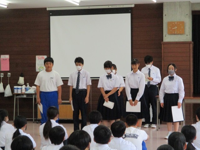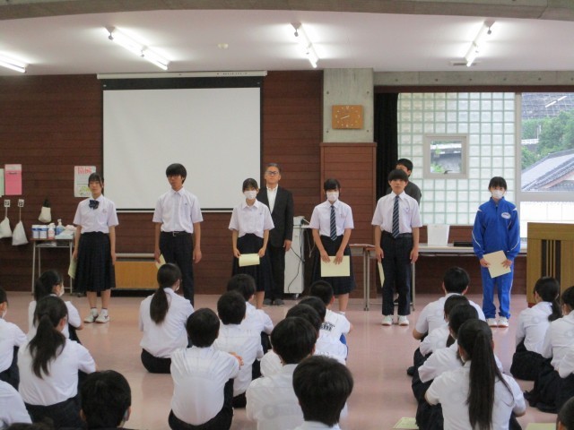 少年の主張、歯と口の健康標語の表彰です。たくさんの生徒が表彰され、生徒たちから拍手が送られていました。
