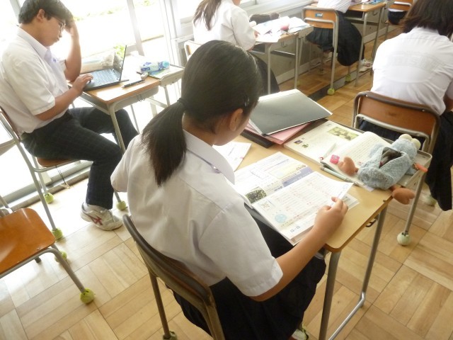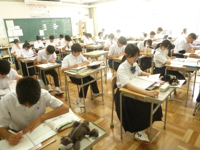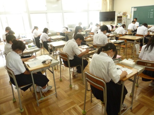 本日から3日間に渡り1学期の期末テストが行われます。生徒は、テストに向けて家庭で学習を進めてきました。本日行われる教科は、「英語」「音楽」「国語」です。教室をのぞいてみると、テスト勉強をしていました。3年生にもなると定期テストにも慣れてきており、集中してこれから行われるテストに備えて勉強していました。さすがです。