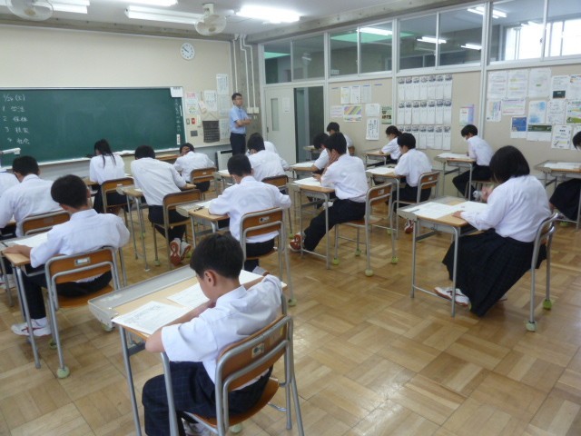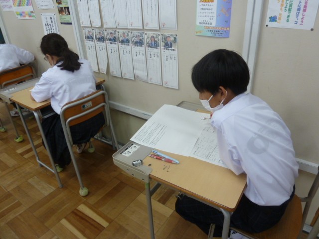 期末テスト2日目となり、少しずつペースがつかめてきた1年生です。今日も3教科のテストに連続して取り組みます。「テストばっかりで疲れる。」という気持ちも持つと思いますが、うまく乗り切ってほしいです。期末テストではテストに出題される範囲が明確に示されるので、家庭において事前にしっかり復習をして、準備することがとても大切です。「〇〇のワークの問題をノートに解いた。」「テスト範囲の教科書を何度も読んだ。」「問題集がまだ最後までできていない。」思い思いの家庭でのテスト勉強が聞かれました。初めての期末テストを経験して、どのようなテスト勉強をするとよいかも分かってくると思います。