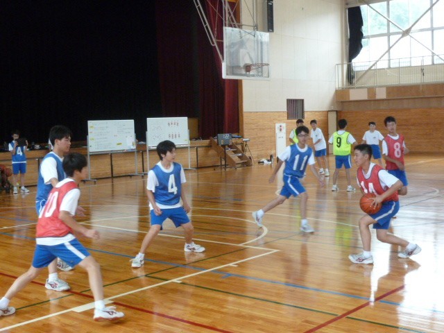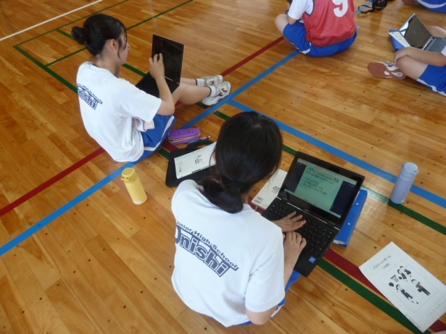 3年生の保健体育は、「バスケットボール」を行いました。めあては「フリーでパスを受けるにはどうすればよいか考え、仲間に伝えよう。」です。3人対3人でゲームをしているところの動画を撮影し、映像を見ながら、フリーでパスを受けるためのポイントを見つけ、友達に教え合いました。見つけたポイントを意識しながら、再度ゲームをしました。2回目のゲームはとてもスムーズで何度もパスがつながりました。よく考えてバスケットボールができている3年生です。