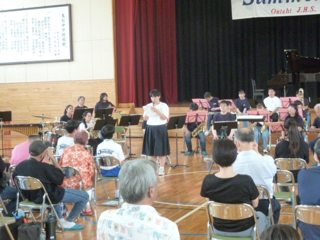 サマーコンサートの後半は、鬼石吹奏楽団の皆さんに協力していただき、鬼石中吹奏楽部と鬼石吹奏楽団によるジョイントコンサートです。人数も多くなり、前半とはまた違った演奏会となりました。「夏色」「RPG」「ジャンボリミッキー」「フニクリ・フニクラ」「We are the World」という曲順でしたが、どれも中学生と大人の心が一つになった演奏で、聴いているものを夢中にさせるコンサートでした。後半のステージも大きな感動を生みました。鬼石吹奏楽団の皆さん、暑い中生徒たちのためにありがとうございました。また、3年生は本日のサマーコンサートを最後に部活動を引退となります。これまで3年間よくがんばりました。お疲れ様でした。
