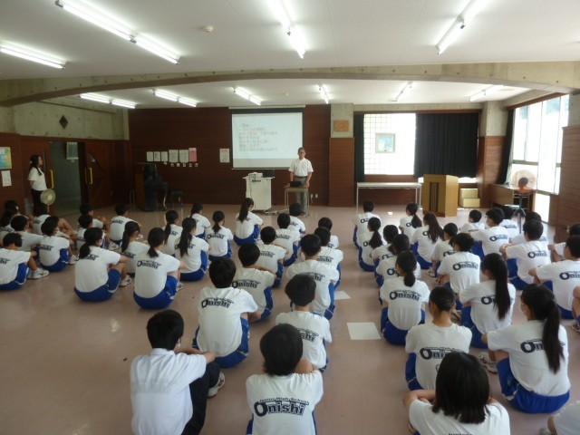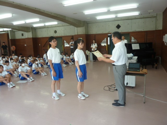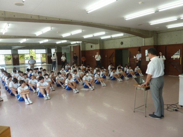 朝の活動として7月の朝礼を行いました。最初に表彰をしました。「陸上大会」「少年の主張大会」「野球大会」と多岐にわたる分野での賞状伝達となりました。鬼中生頑張っています。次に校長先生からお話を聞きました。今日のテーマは、「誠を尽くせば天に通ず」(本気でやれば願いは叶う)についてです。努力をしたとしても、いつもうまくいくとは限りません。もしかすると失敗の方が多いかもしれません。そんな時、「どうせうまくいかないから、もうやらない。」とするのでなく、失敗の中にも次の成功のもとになるものがあるから、物事に対して本気で取り組んでいこうという内容でした。校長先生からの檄を受け、意識が変わり、これから本気になって物事に取り組む鬼中生を見るのが楽しみです。