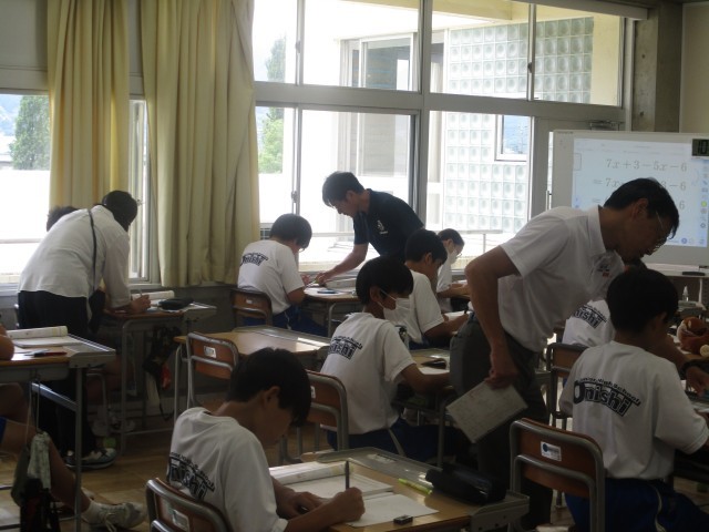 1年生の数学は1次式の計算でした。今日は、式のなかの同じ文字をふくむ項をまとめて計算する練習をしました。3人の先生できめ細かく指導しています。