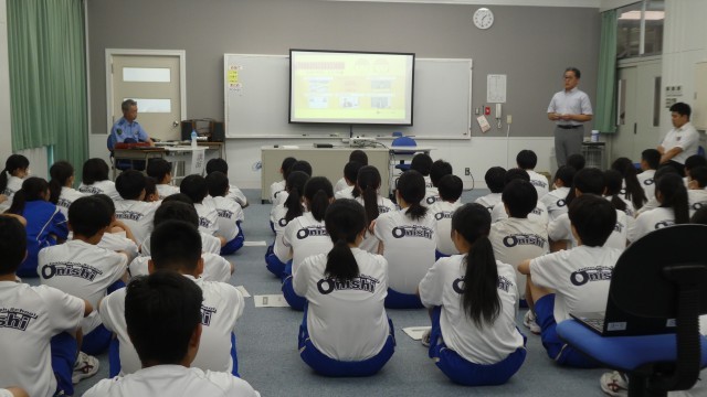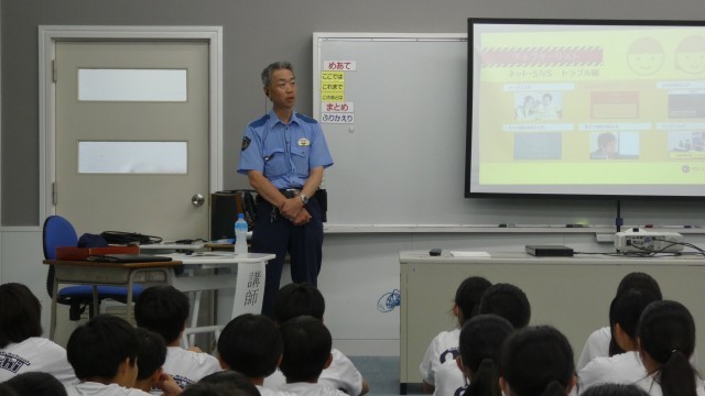 5校時に情報モラル講習会を実施しました。講師として鬼石駐在所の所長さんをお招きし、ネット利用に関する県内外の中学生の利用実態、ネットモラル、SNS利用上の危険や留意点等についてお話しいただきました。