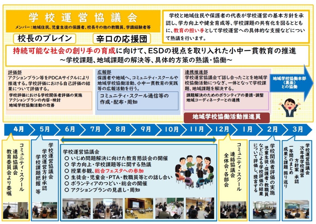 コミュニティ・スクールとは、学校運営協議会が設置された学校のことをいいます。そして、 その役割は、校長が作成する学校運営の基本方針を承認すること、育てたい子ども像の実現 に向けて熟議し、協働していくことです。