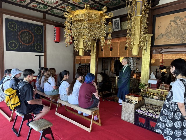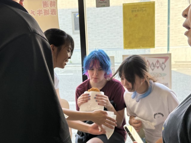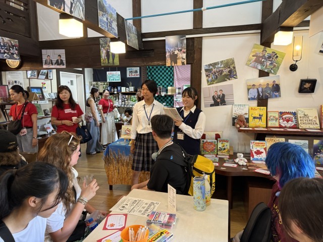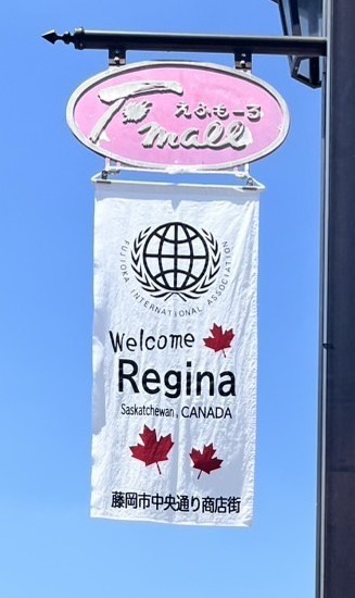 この日、藤岡とリジャイナの生徒たちは班に別れて市内の商店街を巡りました。昨年度に訪問したときの写真や歓迎会で寄贈された絵本の展示会、お寺や蔵の見学、かき氷やコロッケの試食をして満喫していました。各スポットには高校生ボランティアがおり、英語で一生懸命に説明をしてくれました。また、カナダの生徒たちは商店街で作成していただいたリジャイナ歓迎の旗を嬉しそうに見上げていました。