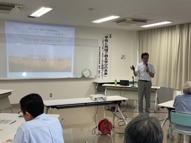 講師には、栃木市地域政策課の社会教育指導員である鈴木廣志先生をお招きし、「学校と地域で創る学びの未来 ~コミュニティ・スクールと地域づくり~」と題してご講演いただきました。