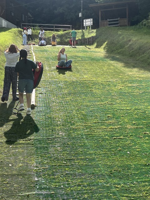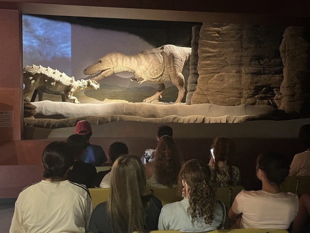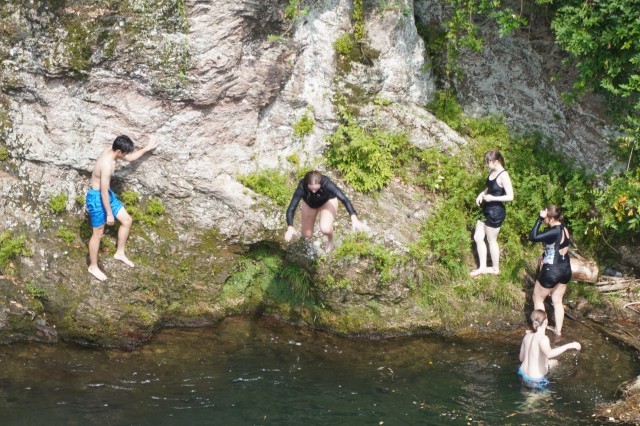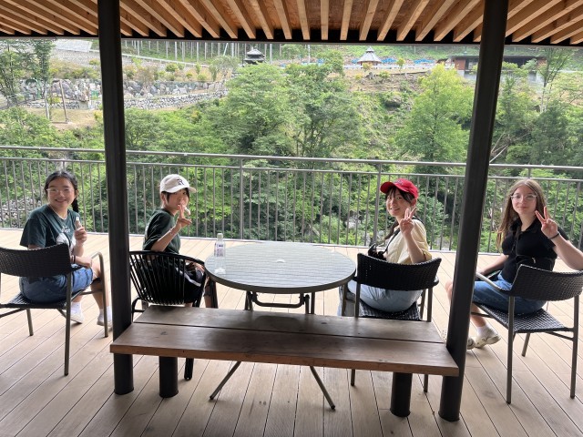 この日、朝ごはんを食べた後にキャンプ場内にある芝そりで楽しみました。その後、キャンプ場を出発して神流恐竜センター、万場の里(道の駅)を訪れた後、川遊びをしました。岩場から豪快にジャンプする生徒もおり、とても楽しそうでした。