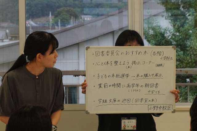 班別協議では、各一貫校における、読書啓発に向けた取組の成果や課題を基に、子どもたちが、より読書に親しめるようなアイディアを具体化する話し合いがなされました。図書館担当の先生方や巡回司書の皆さんの熱心さの中に笑顔があふれる話合いとなりました。