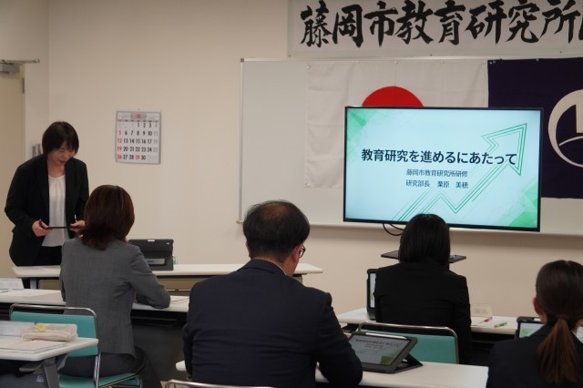 教育長からは、「研究所には特別な思い入れがある」とご自身の経験に触れながら、教育基本法第9条を引用し、教員としての崇高な使命を自覚し、研究と修養に努めてほしいとの期待が示されました。また、「授業実践班」「授業研究班」「課題研究班」それぞれの意義や役割について具体的な説明があり、1年間の研究の見通しが共有されました。