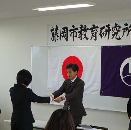 平成31年度藤岡市教育研究所開所式が行われ、11名の研究員と2名の所員に教育長から委嘱状が手渡されました。田中教育長からは、「実践的研究は子どもの姿からスタートし、検証も子どもの姿である」「課題研究班の取組が、他教科、他校区に広がり、小中一貫教育の一つのスタンダードとなってほしい」と励ましの言葉がありました。