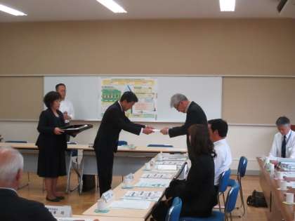 14:30より、北中学校にて第1回学校運営協議会が行われました。田中教育長から11名の委員さんに委嘱状が渡されました。