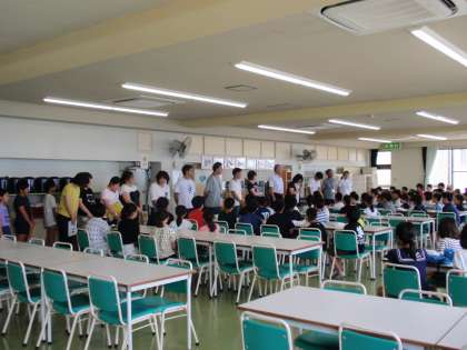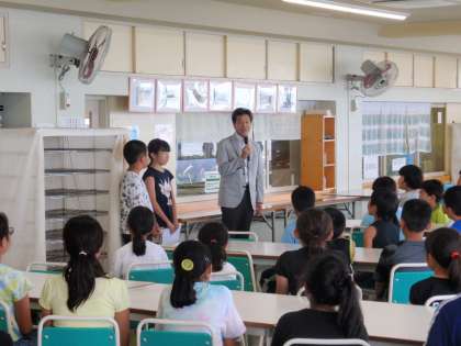 最初に、今日で二泊三日の臨海学校が終了となる美九里東小、美九里西小、鬼石北小、鬼石小の退校式に参加しました。海水浴や集団生活を通してたくさんの思い出ができたことを振り返りました。日焼けした子どもたちの表情は良い経験ができた満足感に満ちていました。