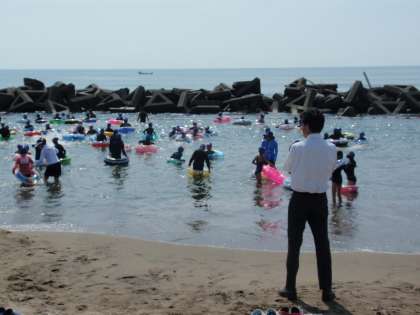 続いて、今日から臨海学校がスタートする神流小・日野小の入校式に参加しました。田中教育長からは「2つのつながりを学んでほしい。1つは友達や先生など人とのつながり。もう1つは、海などの自然とのつながり。この2つのつながりを大切にして、楽しい思い出づくりをしてほしい。」と激励の言葉がありました。午後には、海水浴を楽しむ神流小・日野小の子どもたちの元気な姿が見られました。