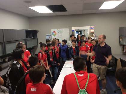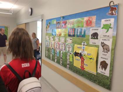 8月5日(月)カナダ・ホームステイ4日目No.6 公開日 2019/08/07 更新日 2019/08/07 カナダホームステイ 先生方の実務ルームに案内されました。ホワイトボードのテーブルの上で、授業のアイデアを出し合ったり、生徒に説明したりするそうです。 色々な国の方がいるので、使う言語が子どもたちによって違うようです。学校では英語とフランス語の授業が多いようです。