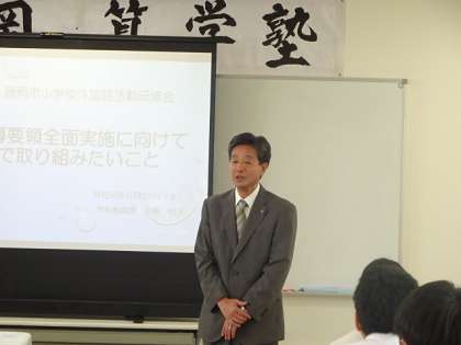 はじめに田中教育長から「外国語活動の授業では、先生も子どもと同様に瞳を輝かせている。小中9年間の学びのつながりを通して、英語を通して子どもたちが人とのつながりを大切にし、心を込めたやり取りができるようになってほしい」と話がありました。