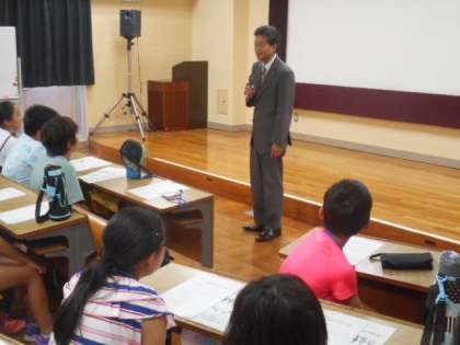開講にあたり、田中教育長より英語で「夏休みの最後に参加してくれてありがとう。みなさんが英語を楽しんでくれることを期待しています」とあいさつがありました。