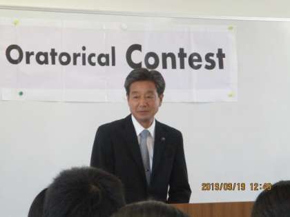 本日、教育庁舎において、標記の大会が開催されました。開会にあたり、田中教育長より、英語で挨拶がありました。特にその中の2つのメッセージ「Think Globally, Act Locally」「Don’t forget smiles like 笑う埴輪」は、生徒にとって心に残る言葉となり、緊張の表情から、発表を楽しもうという表情に変わったように見られました。また英語部会の担当校長である小野中吉崎校長先生からも英語で激励の言葉がありました。