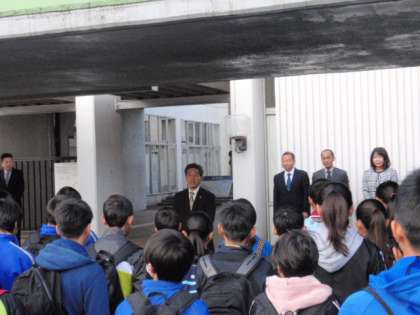 県陸上教室記録会に出場する選手の結団式が6:50より藤岡市役所前にて行われました。結団式の中で田中教育長より「今日の県大会では、藤岡市の代表として、より速く、より高く、より遠くへ自己記録更新目指して頑張ってほしい。これまでの自分自身と比べて、今日の記録はどうだったのか。また、県大会を経験して、このあとは自分自身をどのようにしていくのかを大切にしてほしい。」との激励の言葉がありました。