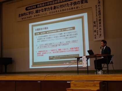 当日は、150名を超える多くの参加者が集い、低中高学年の各ブロックに分かれて、公開授業の参観と授業研究会での熱心な協議を行いました。また、全体会後の講演会では、「考えを深める道徳教育のあり方」と題して、麗澤大学大学院准教授の 富岡 栄 先生よりご講演をいただきました。