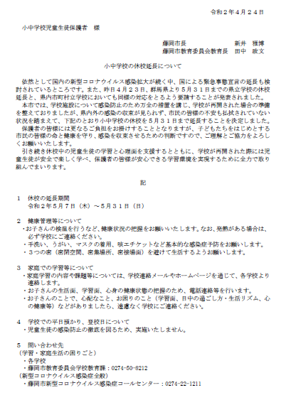 本日、小中学校の休校を5月31日まで延長することを決定しました。