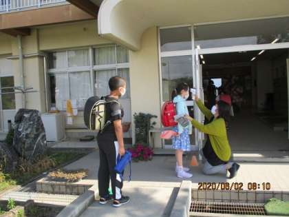 その後玄関前で非接触型体温計による検温を実施し、各クラスへ入り学習の準備をしていましたが、その姿からは、学校再開を喜んでいる様子がうかがえました。
